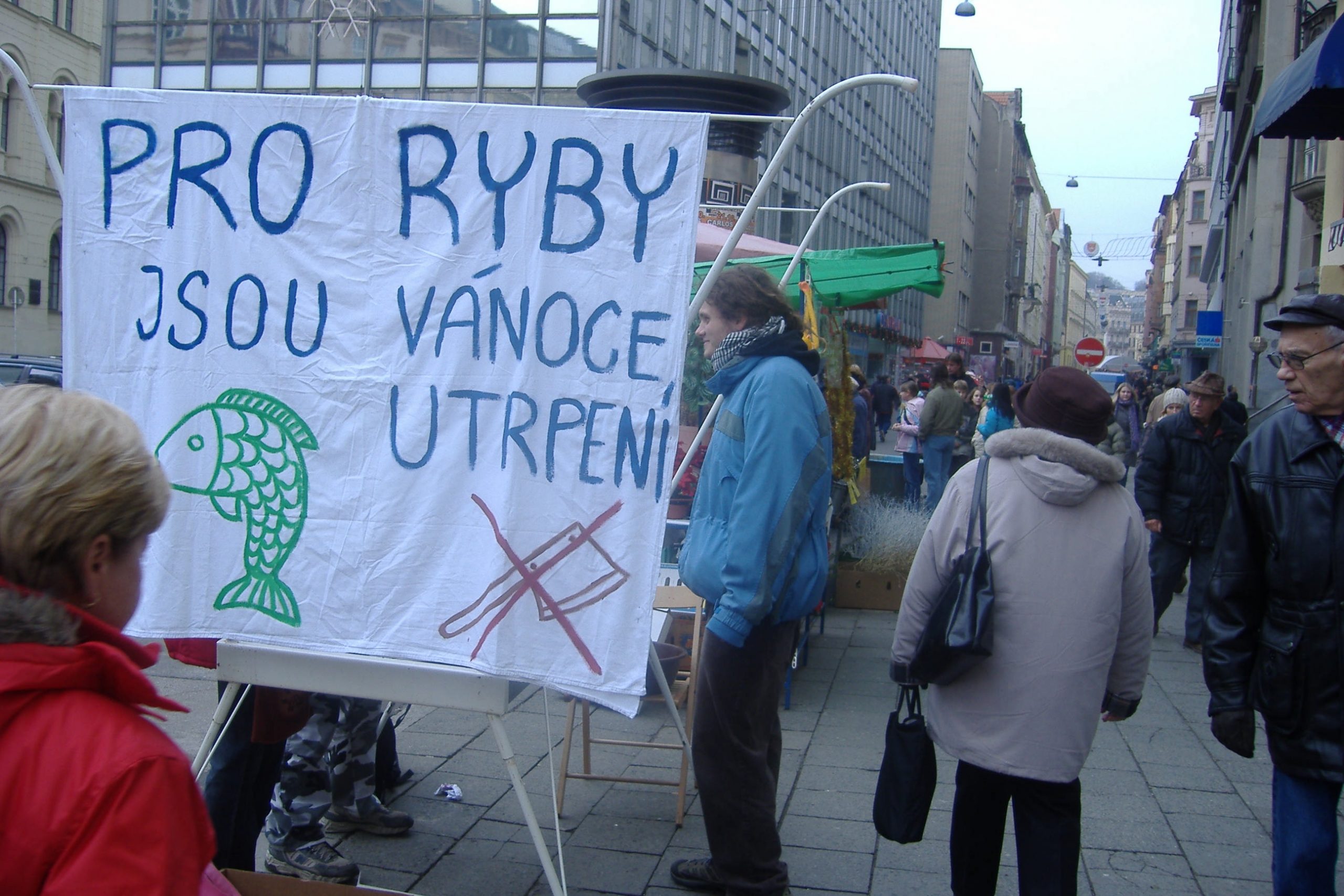 Před Vánoci pořádáme stánek, který upozorňuje na neetické zacházení s kapry.
