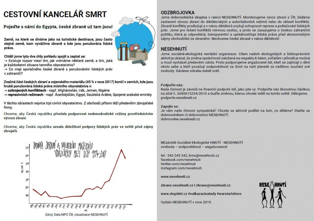 NESEHNUTÍ si připravilo k protestní akci STOP IDET (reakce na zbrojařský veletrh IDET 2019) informativní výstavu, díky níž se dozvíte o tom, co mají společného české zbraně s porušováním lidských práv v zahraničí. Jak to vypadá v Egyptě, Jemenu nebo Vietnamu? A jaký existujerozpor mezi tím, jak vnímáme některé země, a tím, jaká je každodenní situace tamního obyvatelstva?