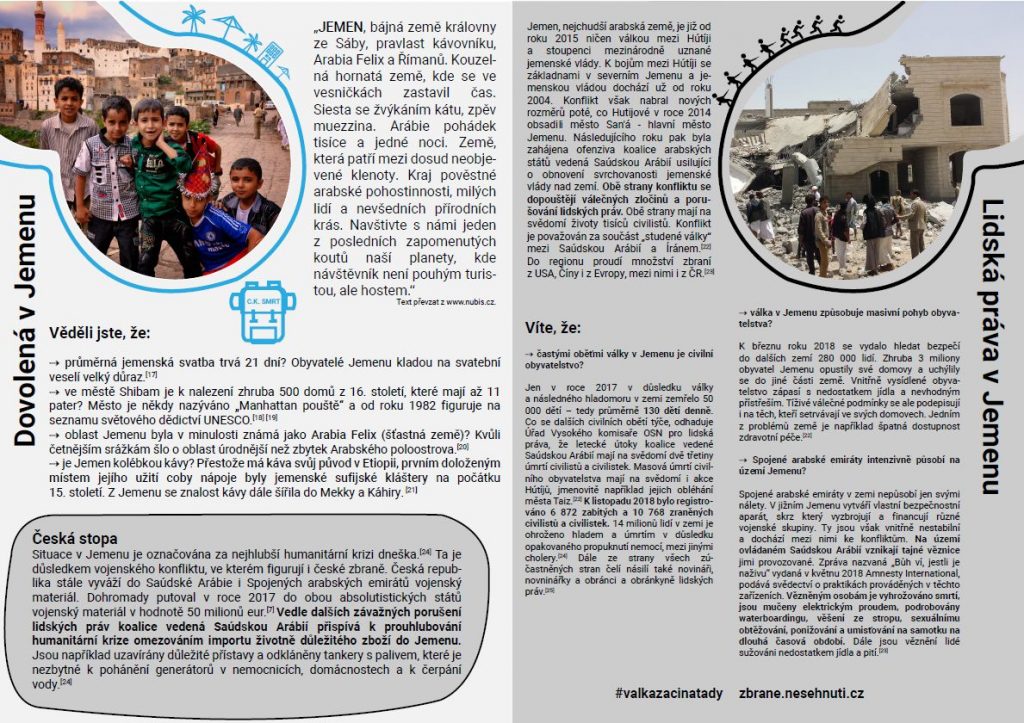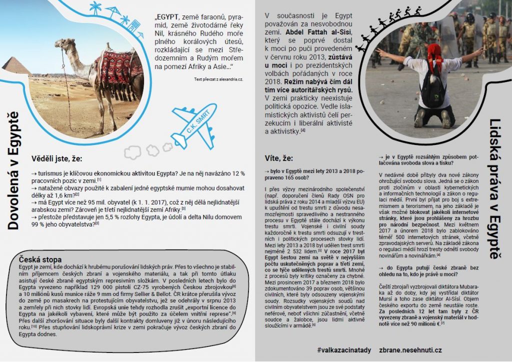 Kromě nás, obyčejných českých cestovatelů, turistek, poutnic a dobrodruhů jsou velkými cestovatelkami také české zbraně. Do mnohých míst, kam cestujeme za poznáním a oddechem, se už před námi vypravily české pistole, náboje a další vojenský materiál. Vybírají si přitom až příliš často nesvobodné země (v roce 2016 52 %, v roce 2017 45 % českého zbrojního exportu) nebo přímo konfliktní regiony.